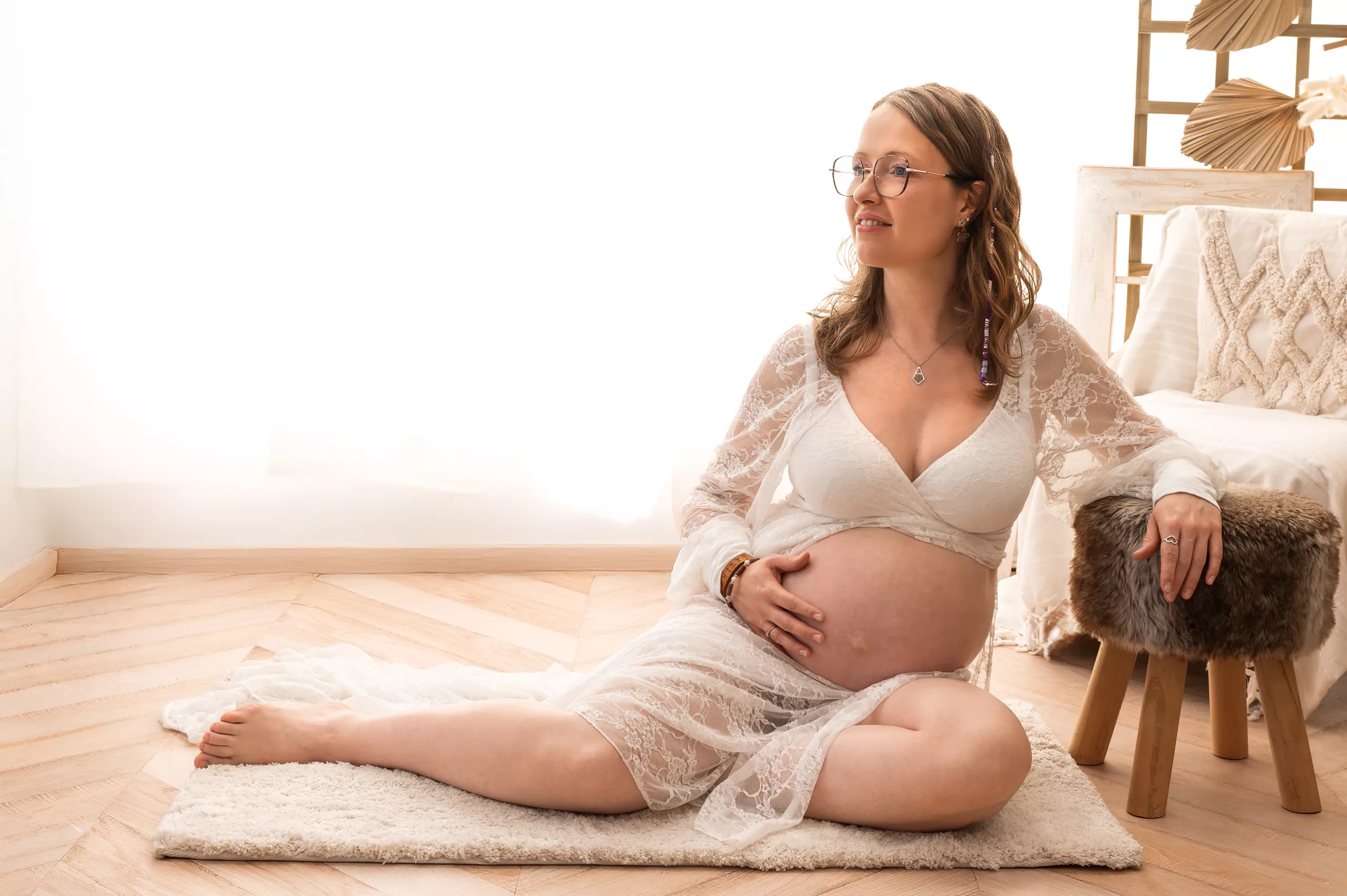 Des fonds et décors aux teintes douces et organiques couplés à une lumière soigneusement réfléchie permettent de mettre en valeur la beauté des courbes des futures mamans.
